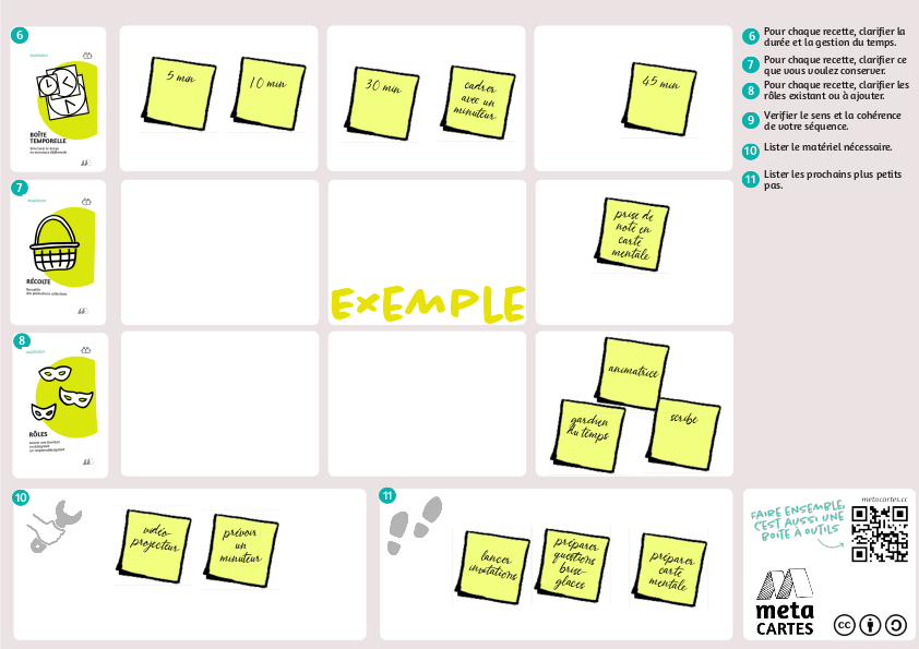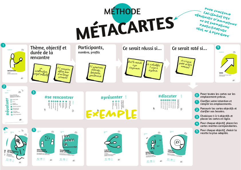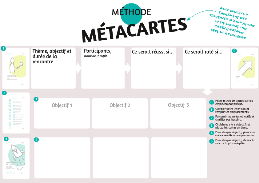 Cette méthode s’appuie sur les cartes Faire Ensemble ainsi qu’un nouveau canevas ( une trame, comme un tableau prérempli). Ce canevas vous guide pas à pas dans la conception de vos ateliers, en vous aidant d’abord à clarifier votre intention, puis vos différents objectifs avant de vous proposer différentes méthodes d’animation adaptées.