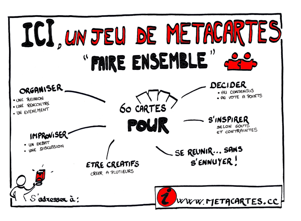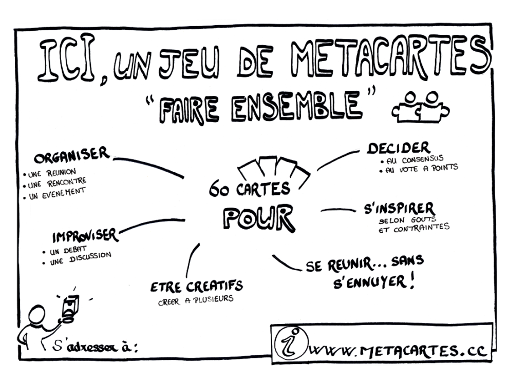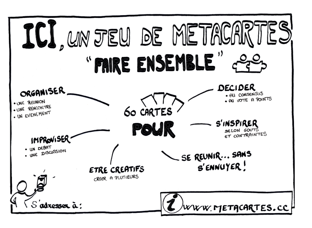 Vous disposez d’ un jeu de Métacartes, mais il est rangé dans un tiroir ? Voici une affichette A4 à coller dans votre salle de réunion et à compléter si nécessaire avec le nom de le personne qui garde le jeu.