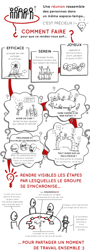 Se réunir, au travail, à l’école, au sein d’une asso ou en famille, fait partie de notre quotidien. Nécessaires à toute activité collective, ces moments passés ensemble peuvent parfois s’avérer fastidieux, décourageants, être source de tensions entre les participants, et finir par démobiliser… Simples à prendre en main, agréables et efficaces, les cartes Synkrominos proposent d’observer et de cadrer quelques éléments clés sous forme d’un parcours aide un groupe a s’organiser pour des réunions efficaces, sereines et joyeuses !