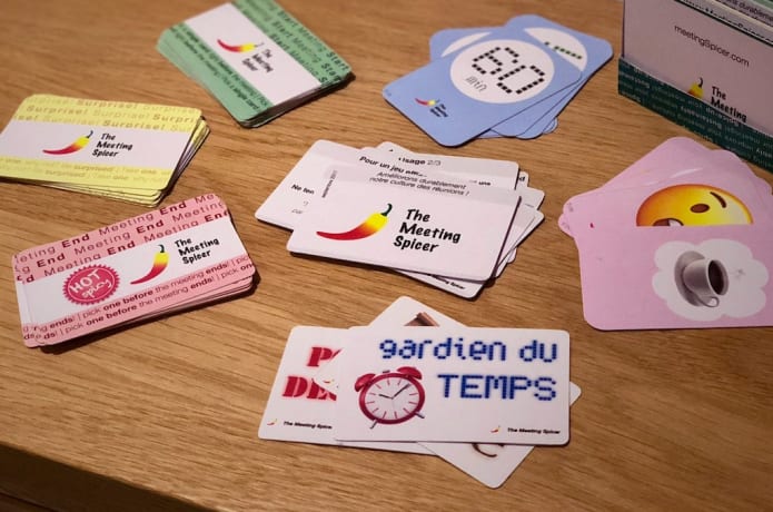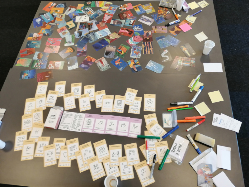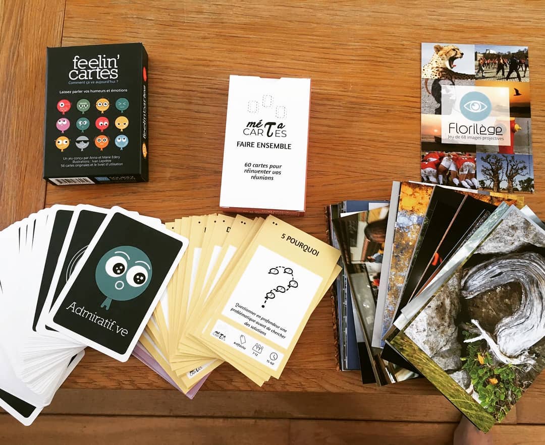 Des jeux de cartes thématiques (liés à une recette en particulier) peuvent venir en support pour faciliter l’usage/l’appropriation de la recette : ex cartes MÉTHODES DES SIX CHAPEAUX, cartes pour aider à remplir les quadrants du BUSINESS MODEL CANVAS.