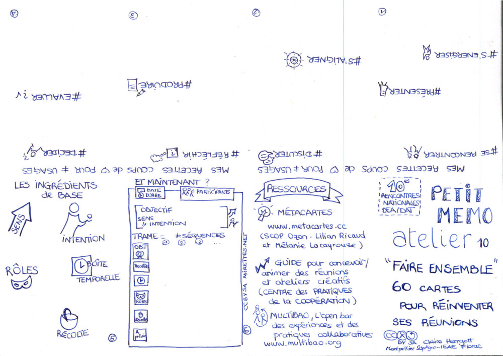 Chose intéressante, ce livret avait été inspiré par un minilivre mémo facilitation graphique initialement conçu par Mélanie pour ses ateliers sur le thème de la facilitation graphique. Le mémo de Claire a, à son tour, inspiré Mélanie pour faire un mémo Faire Ensemble. Bel exemple du pouvoir des licences libres qui permettent de créer des productions dérivées !