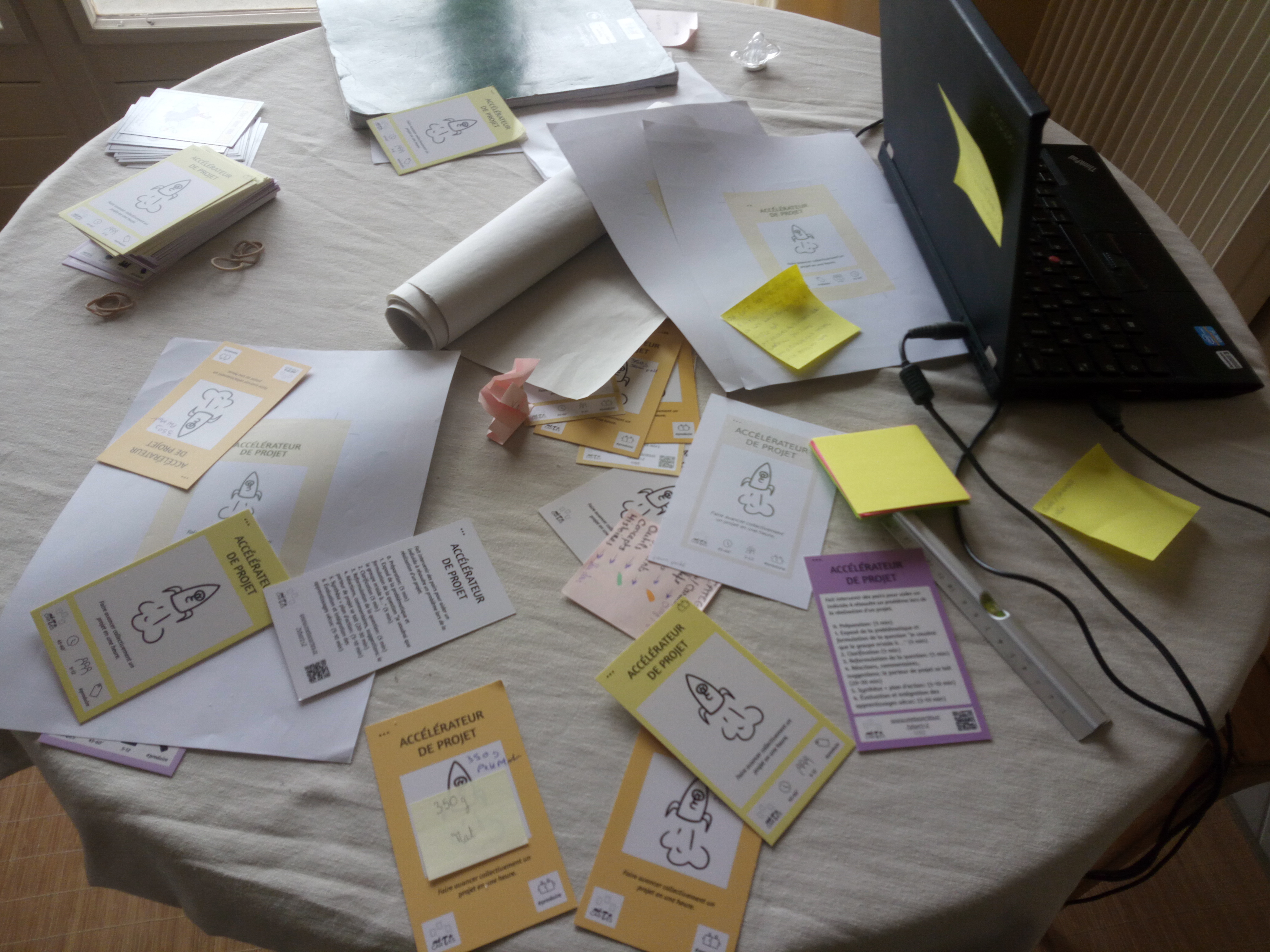 Coté technique, pour être sur que les cartes imprimées soient propres, nous sommes passé de Libre Office qui nous avait servi à faire les prototypes, à Scribus, logiciel libre de PAO (mise en page professionnelle) plus adapté à de la publication.