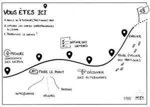 Durant le quart d’heure toulousain, je présente à l’écran la cartographie metacartes “Vous êtes ici” et j’invite les participants à se présenter et à partager où ils se situent, leurs connaissances et expérience en matière de numérique responsable.
